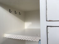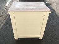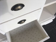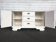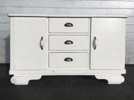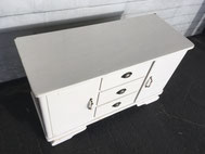 Buffet. Vermutlich dreißiger Jahre. Zwei Türen mit je einem Einlegeboden, drei Schubladen. Rückwand und Türschnapper (verzinkter Stahl) erneuert. Scharniere entrostet. Seiten R/L, Platte, Einlegeböden, Schubladen und Türen aus Vollholz. Griffschalen aus Metall, Griffe aus Metall / Keramik, alt-messig-farben. Hintere, oberen und unteren Ecken mit Beschlägen / Kantenschutz versehen. In linker Tür oben drei verstreckte Schlüsselhaken. Schubladenböden mit stabilem Vlies im Landhausstil ausgekleidet. Einlegeböden mit Spitzenborte versehen. Creme-weiß gestrichen. Vintage-Finish. Maße: 110 x 45 x 66,5 (B/T/H). Noch mehr Bilder von #TS4 finden Sie in der Möbelgalerie. Bei Interesse kontaktieren Sie mich. - 265,00€ (zzgl.MwSt.)