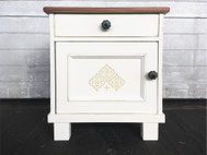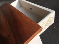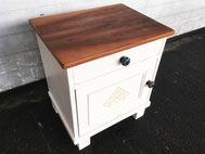 Schränkchen mit einer Tür, einem Einlegeboden und einer Schublade, die nur bei Auszug ihr Geheimnis an den Seiten präsentiert. Vollholz. Oberfläche mit Edelholz furniert, geschliffen und geölt mit küchen- und spielzeuggeeignetem Hartwachsöl. Corpus creme-weiß gestrichen, mit Möbelwachs versiegelt. Tür mit marokkanischem Muster verziert. Keramikknäufe. Vintage-Finish. Maße: 51 x 39 x 57 (B/T/H). Noch mehr Bilder von #TS7 finden Sie in der Möbelgalerie. Bei Interesse kontaktieren Sie mich. - 95,00€ (zzgl.MwSt.)