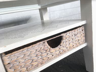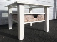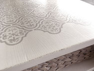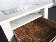 Beistelltisch, Wohnzimmertisch. Vollholz mit Glasplatte und Korb aus Wasserhyazinthe. Zwischenboden mit aufwendigem Muster im Stil marokkanischer Fliesen verziehrt. Creme-weiß gestrichen. Vintage-Finish. Maße: 66 x 66 x 50 (B/T/H). Noch mehr Bilder von #TS6 finden Sie in der Möbelgalerie. Bei Interesse kontaktieren Sie mich. - 82,00€ (zzgl.MwSt.)